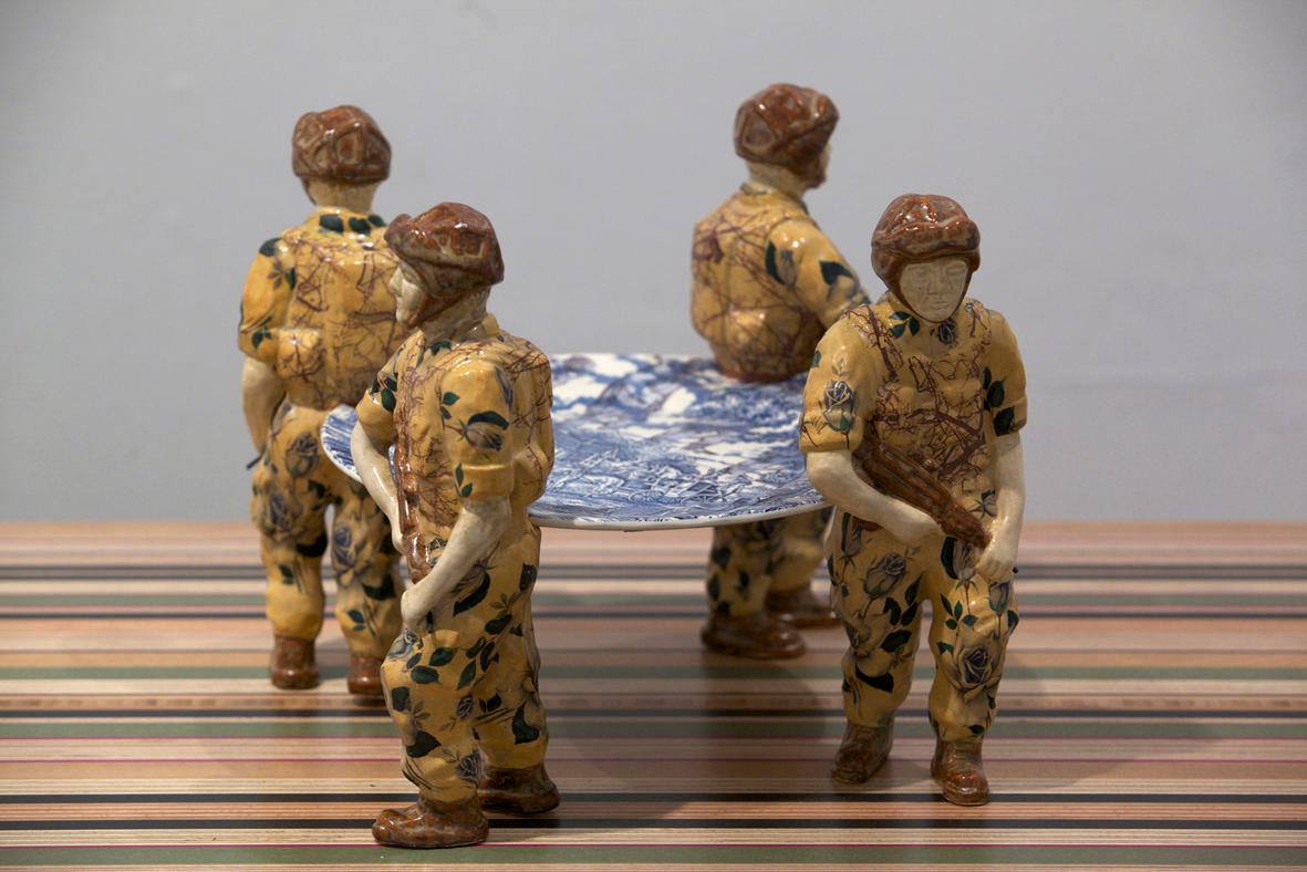 Carol McNicoll, Expeditionary coffee set, 2011, Ceramic figures, found brass tray, chain, found and redecorated coffee pot and cups