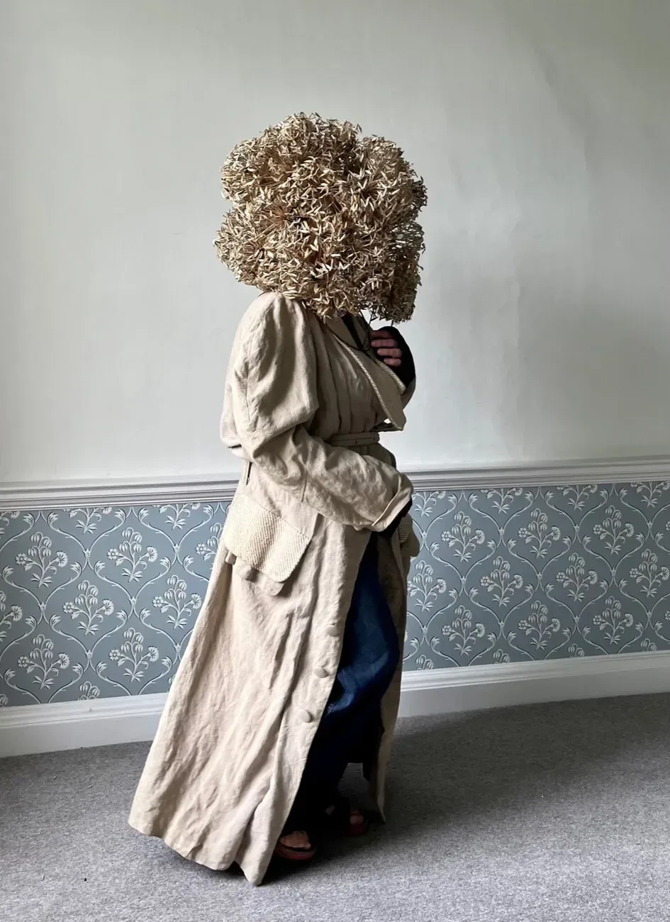 Walking the bounds at 'Performing Green', an exhibition at Bell House Dulwich Agapanthus seed heads and wire headdress, and artists linen coat. This ritual figure walked the bounds of the exhibition space to signify a human being in the natural world