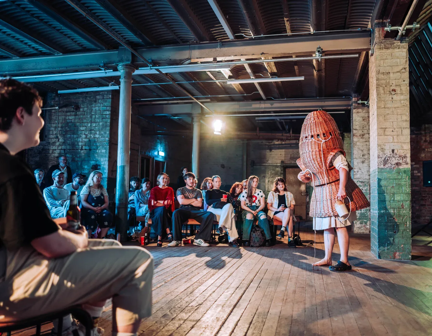 The work served as both a tribute to the wetlands of Somerset, where much of the UK's basket-weaving willow grows, and a critical examination of semi-rural masculinity and romanticised drinking cultures. Through an improvisational ceremony, the artist conjured the character of Vogum Gertlin, an invented anti-hero and traveller from Bridgwater Town, bringing a mix of reverence, chaos, and critique to the stage.