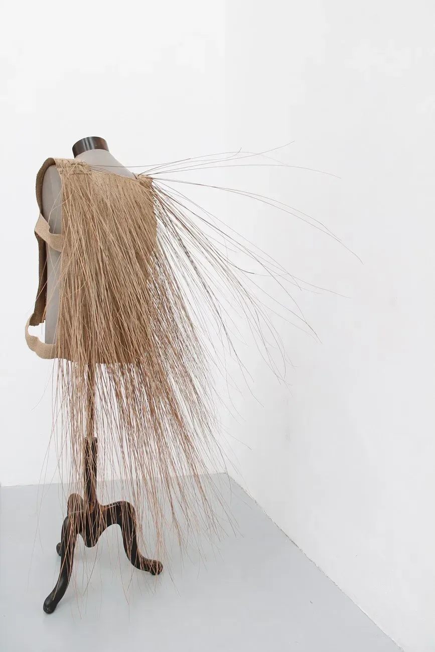 The sculpture to wear series creates a sheltering skin that protects or alters the sense of self in a difficult world. The sculptures have elements of ceremonial architecture and costume, both contemporary and historic. Physically they test the tension between protective constraint and freedom of movement. Tabard was made after watching porcupines raise their quills in self defence. For me the character evoked is that of a battle weary old soldier, the kind with long thick hairs sprouting from his eyebrows, experienced in battle and ready to defend himself and country, but tired and scarred. Made of jute, wax and palm stalks with shop dummy.