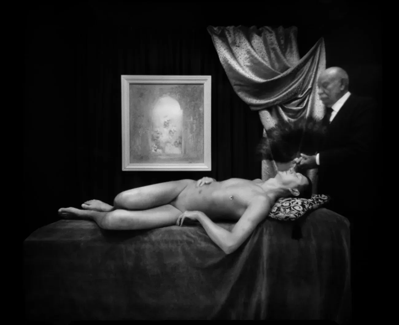 ‘Stilled Lives’ are a series of self-portraits that reference artworks from western history. The pinhole photographs need extended exposure, (usually 3-6 minutes) which requires the sitter to perform stasis for this primitive technology. Remaining still for prolonged periods is reminiscent of the life model’s role, becoming petrified in the temporal drift. Walter Benjamin believed that in early examples of photography, something akin to an ‘aura’ was captured through the long exposures necessary to record the images: “The procedure itself taught the models to live inside rather than outside the moment. During the long duration of these shots they grew as it were into the picture”. (Walter Benjamin – A Short History of Photography)