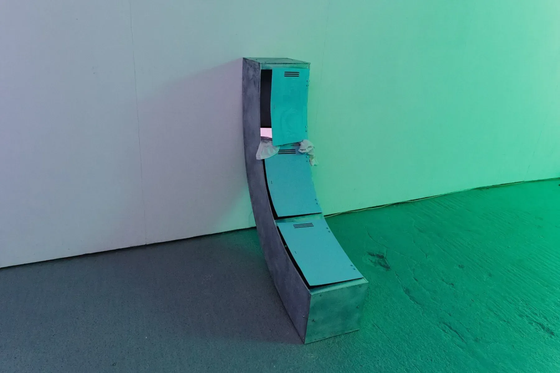 A reimagined locker is slumped against a wall, the top door is ajar to peer inside. MDF, Plywood, Perspex, Cotton, Kindle, Football Kit, Grinder, Socks, Spray paint, metal fixings.
