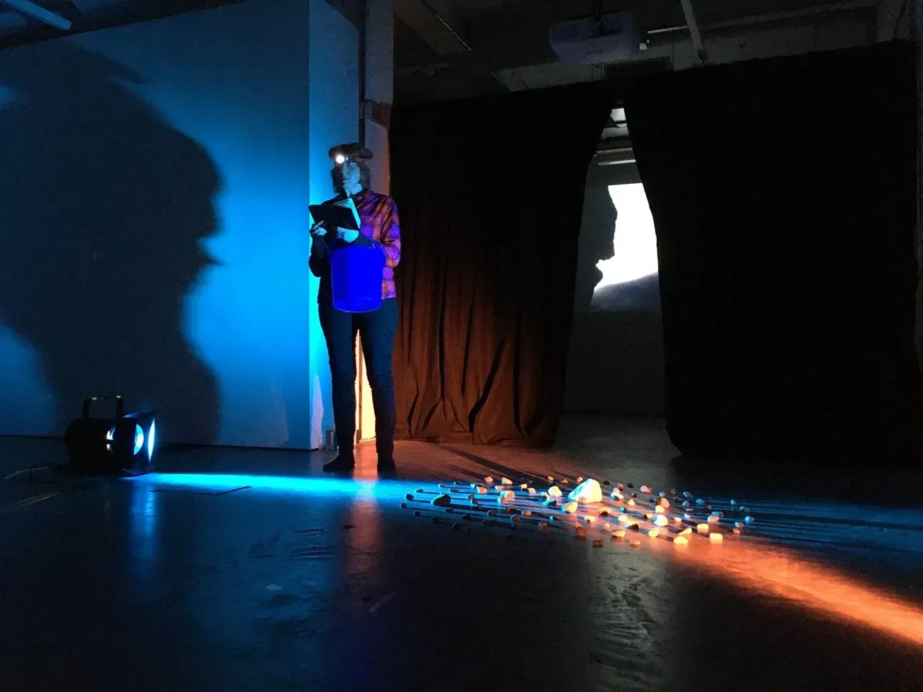 Performance at Baltic 39 Experimental Studio in March 2020, involving stones, sound-producing found objects, the human voice and image projection. This performance was an experiment in placing objects (stones), from a particular rural environment, in an urban artspace, and by doing so, extending the relational field in which they operate. The ritual of placing the stones, speaking and singing the names of flora and fauna of the area, and appealing to a guardian spirit of place from local folklore, was completed by those taking part banging and rattling noise-producing objects; tin cans, shells and a plastic bucket. It was important for everyone there to handle one of the stones, making a physical connection with the stream and wider environment where they were found. The weaving together of the human voice with the sounds and tactility of objects, formed a multisensory, incantatory spiral of appearances, manifesting visually through the stones on the floor. A still image of the sky from the entrance to the cave where the spirit (Hobthrush) is said to dwell, was projected in the recess behind parted blackout curtains, forming another connection with the actual site. The stones were subsequently returned to the stream, connecting the performance back to the running water and wider landscape of their origin. The Experimental Studio provided the space and technical support to enable this exploratory performance that developed as part of a series of works made at archaeological sites, on Orkney and in Teesdale in the North Pennines. The performance Singing Over the Bones was part of the practice-based research element of my Master of Research project undertaken at Northumbria University.