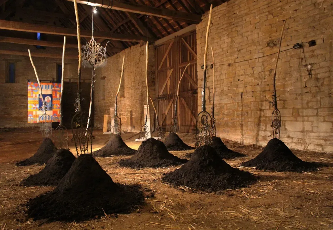 The large tithe barn within The Priory complex, a rare and unique group of medieval domestic and agricultural buildings, was the focus of this contemporary craft project. The title ‘Gather-ing’ references the function of a barn as a space to collect/bring/gather people, animals and crops, as well as a symbolic meeting place to gather for ritual celebration. Curated by Craftspace, artists Stewart Easton , Jacky Oliver, Helen Snell and Gillian Widden were commissioned to make new work made in response to the site. Part of Somerset Art Works’ creative programme Momentum, funded by Arts Council England Lottery Funding. I wanted to explore the underlying tensions and contradictions between pagan and Christian rituals surrounding fertility, sex, birth and harvest. The relationship between the ten forks is inspired by notions of social and moral hierarchies, each farm giving a tenth of their produce to the Church in a material and spiritual exchange.