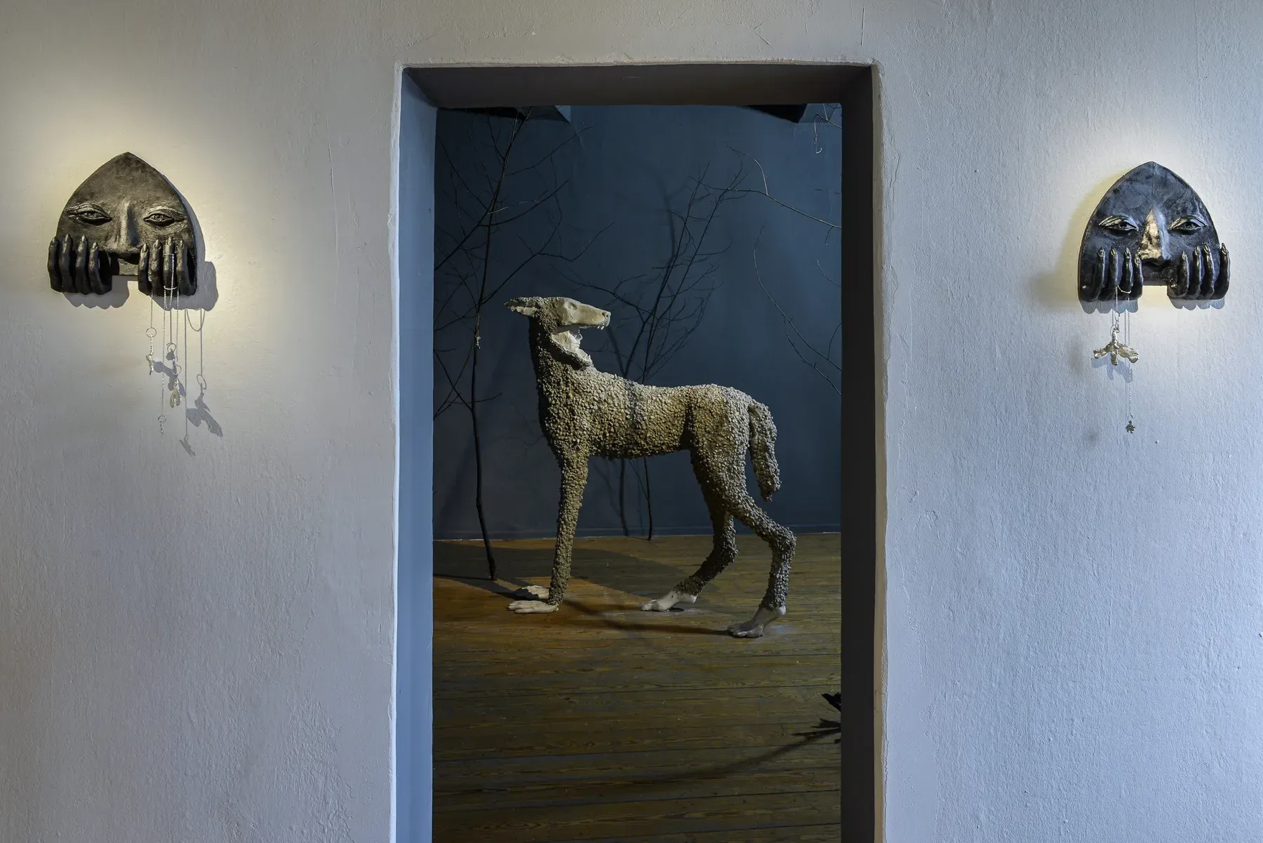 When the Moon Howls explores the (dis)enchantment with the forest after centuries of domestication and fragmentation. In search of wilderness she composes a new ritual narrative to investigate endurance, fear and isolation, reflecting on her experience of walking at night. The sculptural installation across three rooms becomes a haunted house where myth, fairytale and folklore are entangled. The show is a dreamscape. The artist inhabits a wolf's clothing to reconnect with the wild as an antidote to, and escape from, the monotony of ecocide. This metamorphosis channels radical new ways of thinking and connecting to the non-human.