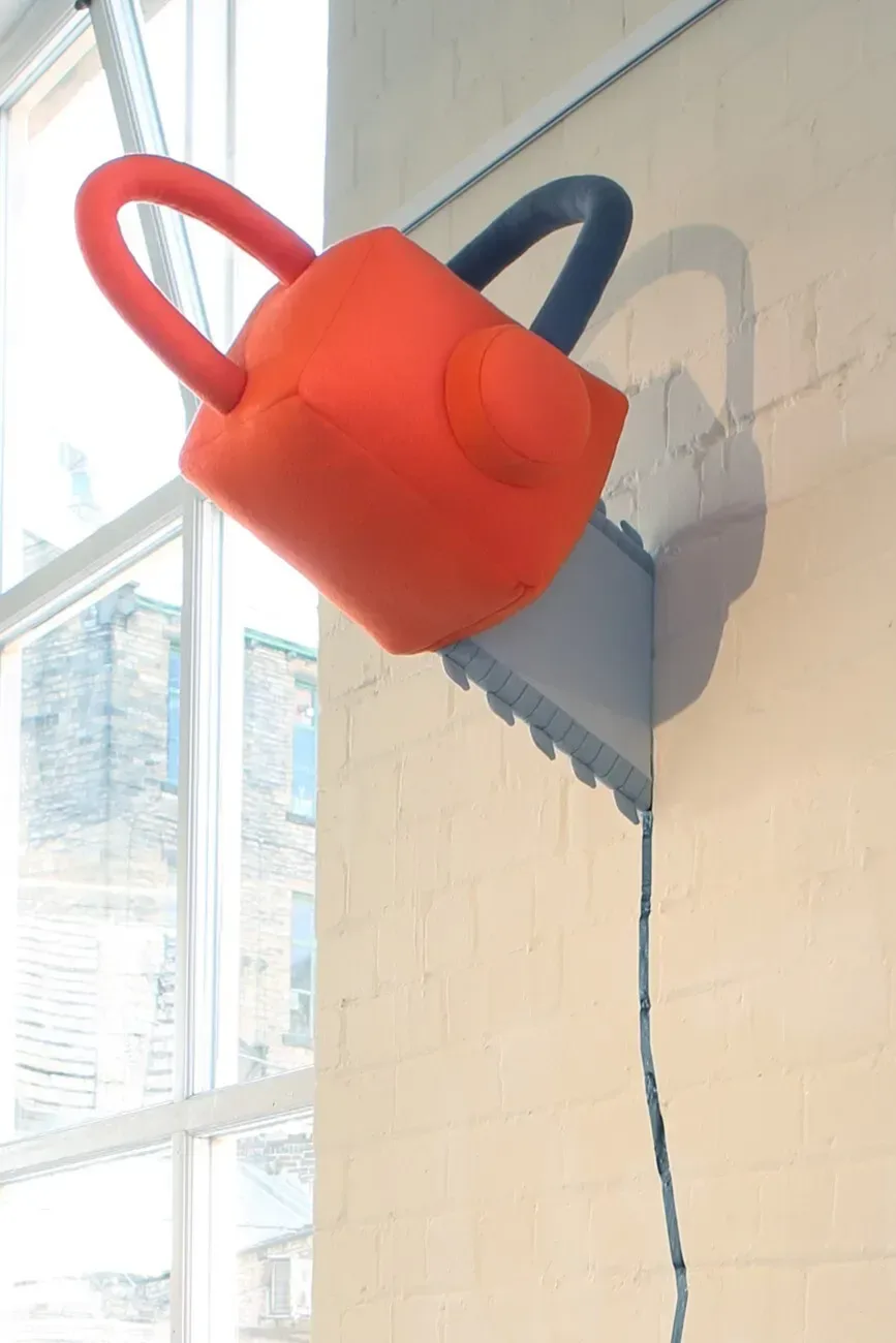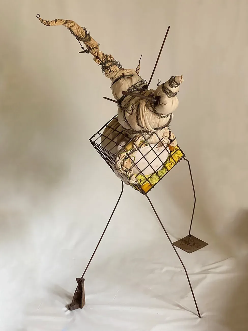 The work is a free-standing sculpture on 3 legs. It has a slight wobble but is stable. It hints at evolving hybrid forms and references the human form through scale and the domestic provenance of some of the materials. All the materials are salvaged, the wire and metal objects having been found in the rural landscape. The contrasts of soft and hard are intended to be uncomfortable, referencing human treatment of nature as well as the toll borne by the human body over time.