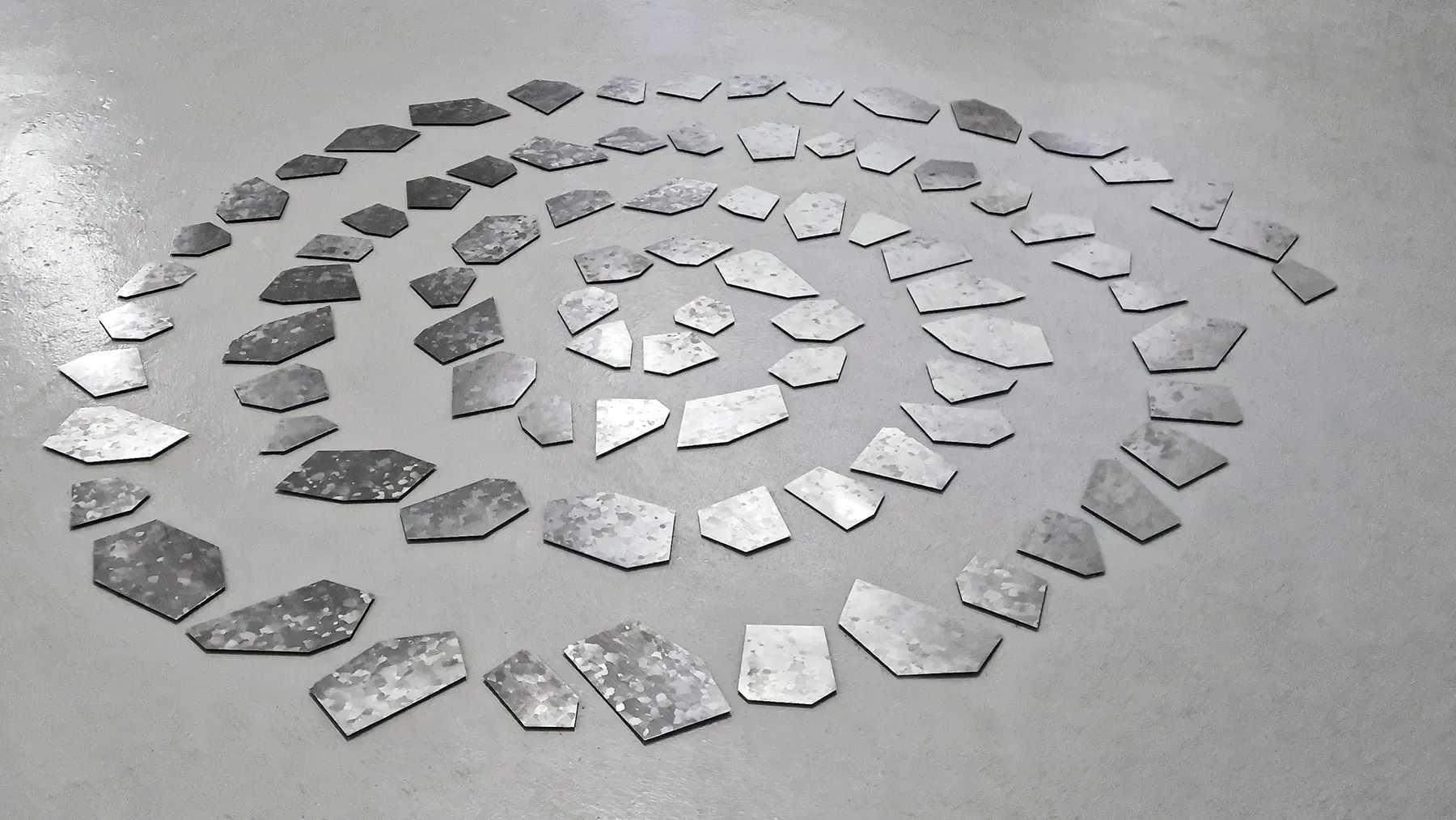 This work uses industrial directional magnetic steel, sanded and etched to reveal the Goss texture of rolled iron silicon alloy crystals. The jigsaw pattern of magnetic domains give this material exceptional magnetic properties. The simple evocation of a spiral described in geologically informed polygons draws upon many references, from the shape of our own Milky Way Galaxy sculpted by vast cosmological magnetic fields and the spiralling molten dynamo generating Earth’s magnetic field, to the inner pathway of spiritual growth and the route to the symbolic omphalos (navel) at the centre of the world where the sky entrance and the underworld meet. The title of this work originates from an ancient Chinese manual on the skills of persuasion, The Book of the Devil Valley Master, containing the first known mention of a compass, known at the time as a south-pointer.