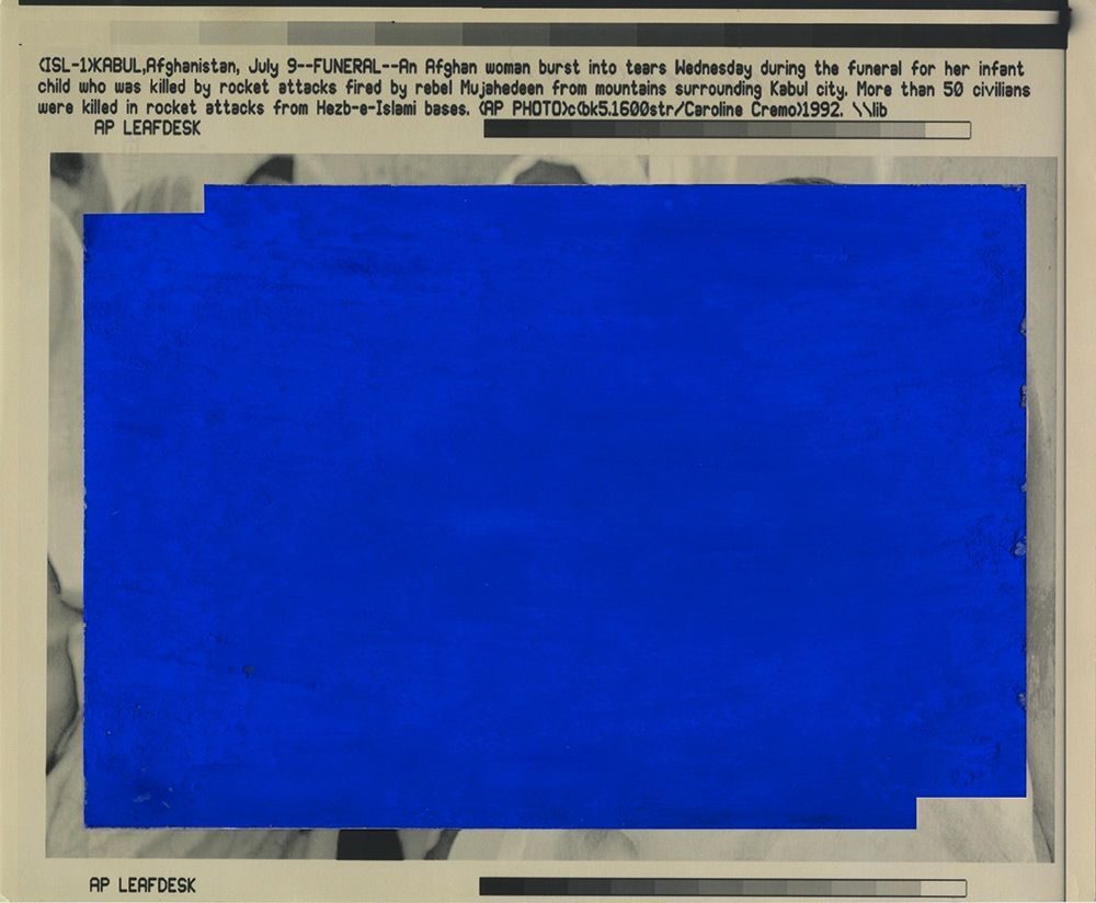 David Birkin, Pietà, 2012. Associated Press wire-photo (1992) overlaid with ultramarine pigment sourced from lapis lazuli mines in Badakshan Province, northeast Afghanistan, 7 x 8 inches