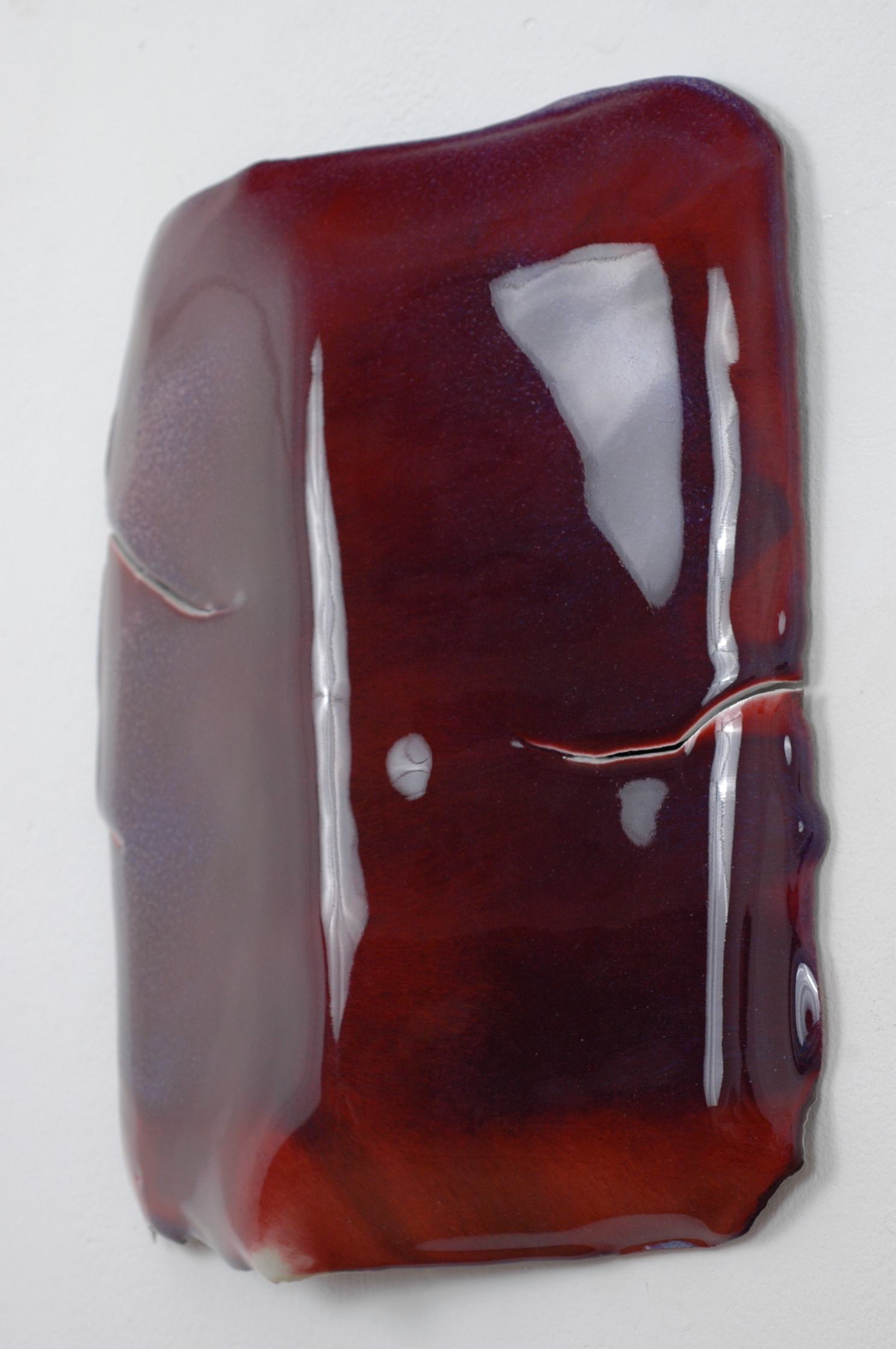 In other work Boos has adopted a looser, more experimental approach in which he allows the clay to take on freer shapes. The resulting objects tend to be thinner, the forms approaching near flatness, pieces that can sit on a table or hang on the wall. Some of the abstract forms recall the curves and modulations of the body, others are more angular, sharper. During firing distortions or re-formations affect the shapes which not only slightly collapse but are affected by the flow of the glaze, some of which runs down to form drops at the edge, other pull the piece apart causing splits, almost as an act of violence.