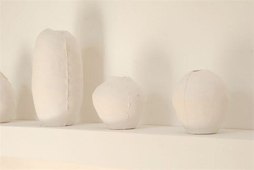 He exploits plaster's capacity for being modelled and built up by joining the components into larger forms which consist of two or more plaster casts of the original clay sections. The aim of traditional casting is to replicate the original model in the final material. In Evans’s 'Anti Autonomes', the finished work is dictated as much by the inherent qualities and creative possibilities which arise from the ‘final’ material (plaster) as those which arise from the ‘original’ material (clay).
