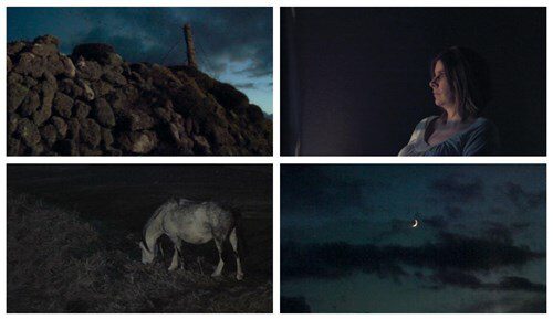 Vigil' (2009) also investigates liminality in the landscape, this sense of shifting time and space. This work is presented as an installation with 5:1 surround sound, creating a completely immersive environment for the viewer. It depicts a number of different physical spaces: a lighthouse and the surrounding landscape irradiated by its rotating beam of light, a farmhouse interior which contains a heavily pregnant woman sitting alone in an empty room, the beam of light rhythmically illuminating her features. The final world presented in this film is the bottom of the seabed, where seals dart through drifting hedgerows of seaweed. Like 'Chwarel', the multiple narratives and perspectives in this film are anchored by a rotating axis – in this case the light of Strumble Head Lighthouse in North Pembrokeshire. This rhythmic light seems to permeate both the land and the psyche of its inhabitants, accompanied by the pulsating sound of a baby’s heart.