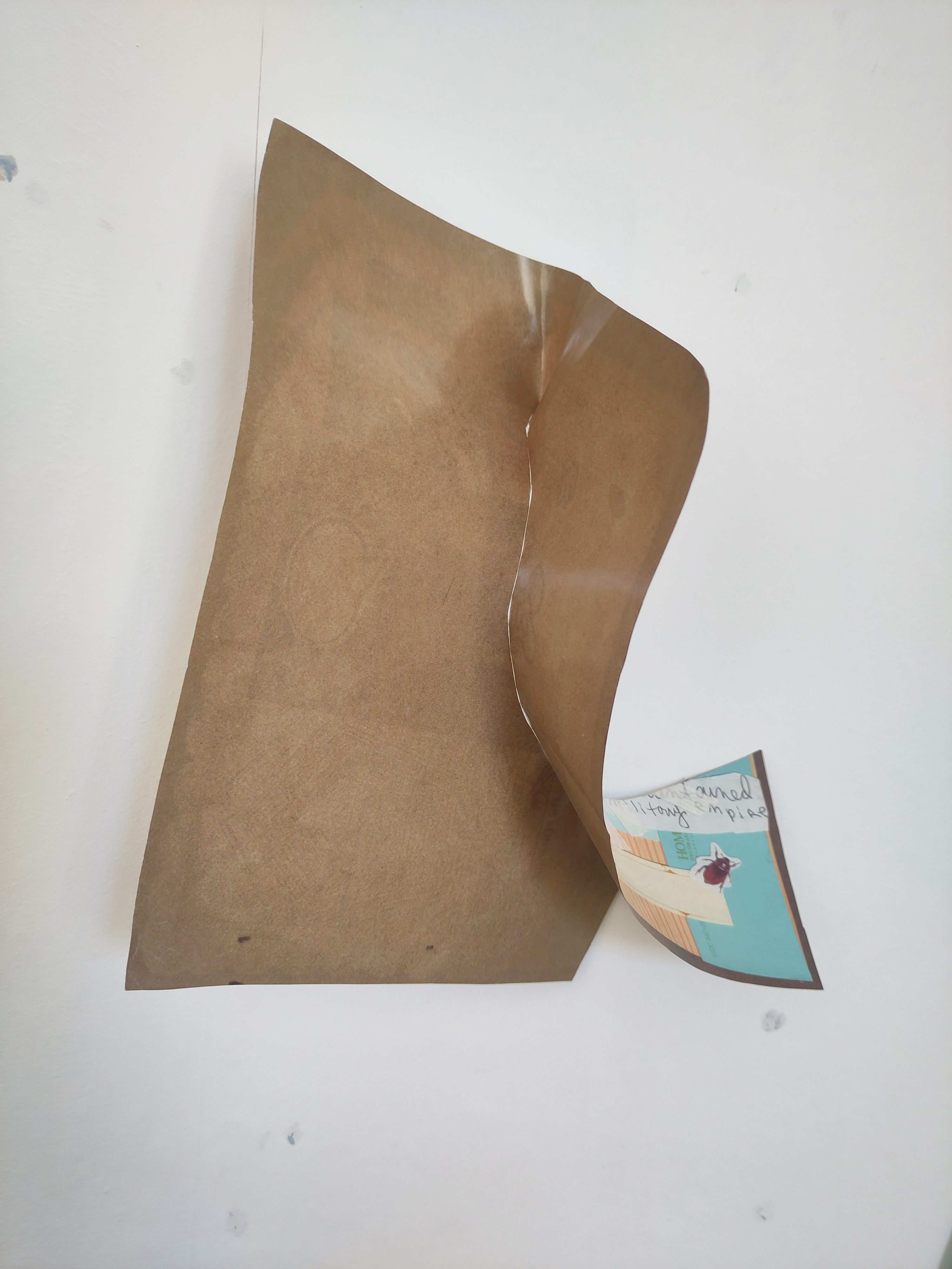 with the contraction of the heavy clay tile as it dries. This prevents it from cracking and the contact within this drying action of the contracting clay, and its impression is held within the wax paper. There is this moment in an action or contact within an event that I am interested in and how an object, material, and bodies can hold the memory of this. The meeting points and overlaps of different surfaces, images and textures within the collages connect with this expression of movement or gesture within the event too.