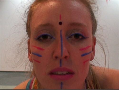 In ‘My American Travels in Craft’, 2011, Aurora's body is not present, but her voice is. On a black screen, a slow slide-show of subtitles flows, telling the story of Aurora's road trip in the U.S.A with her former husband, beginning: “In America I learned that the open road was more suitable and free flowing than being designated to a place”, and going on to explain, “I entered a native sense of mind like I do :)”.