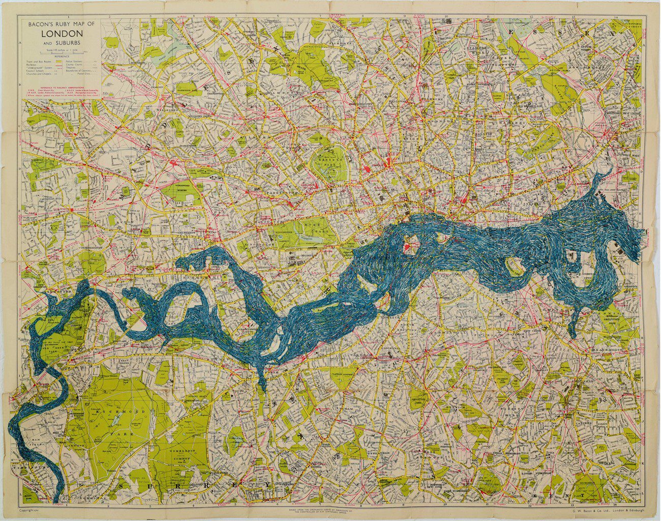 Hand embroidery on old map of London