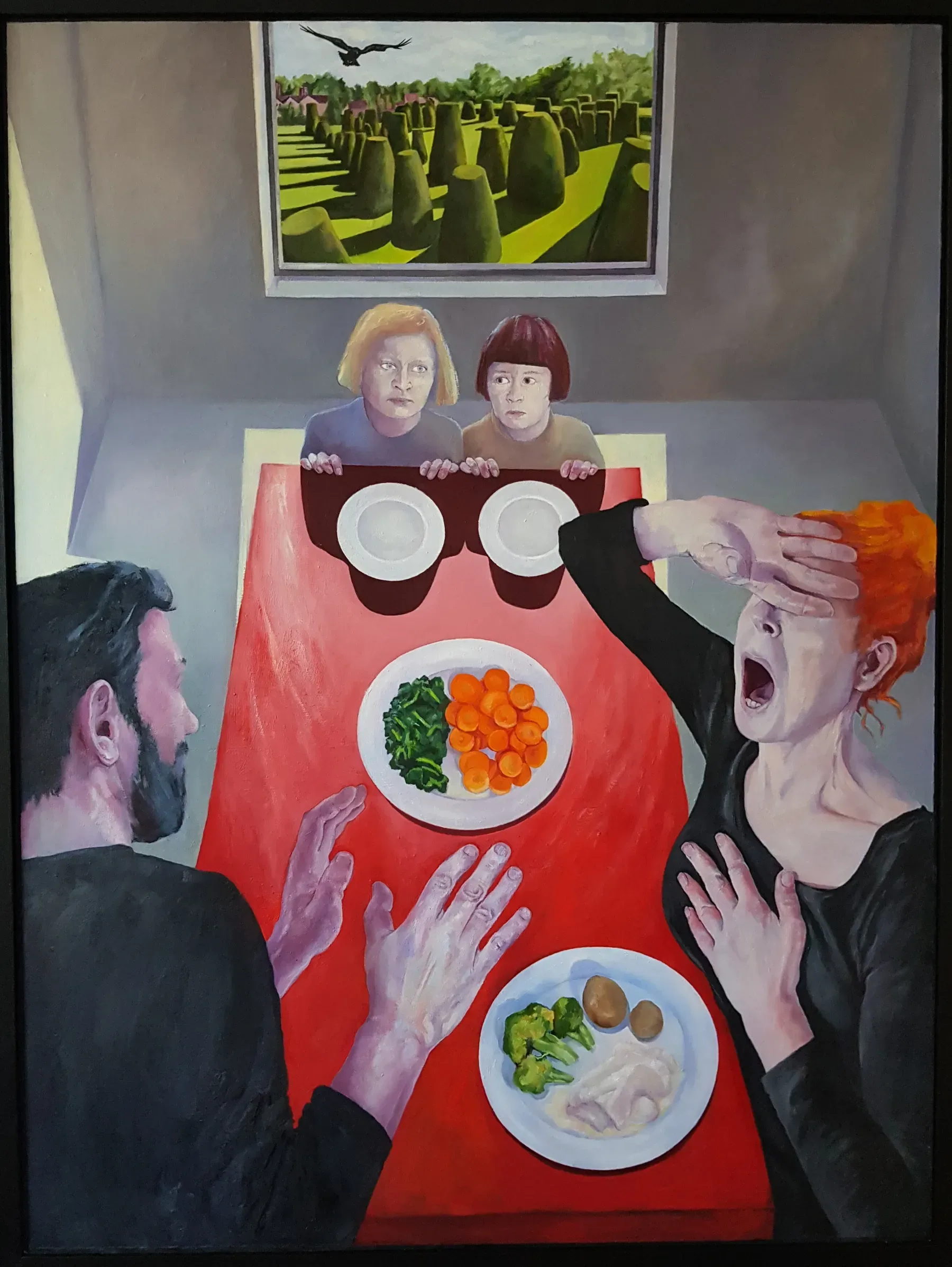 A memory of a regular and typical histrionic enactment during dinner. The bird and advancing topiary are harbingers of further imminent overwhelming impingement requiring normalisation.