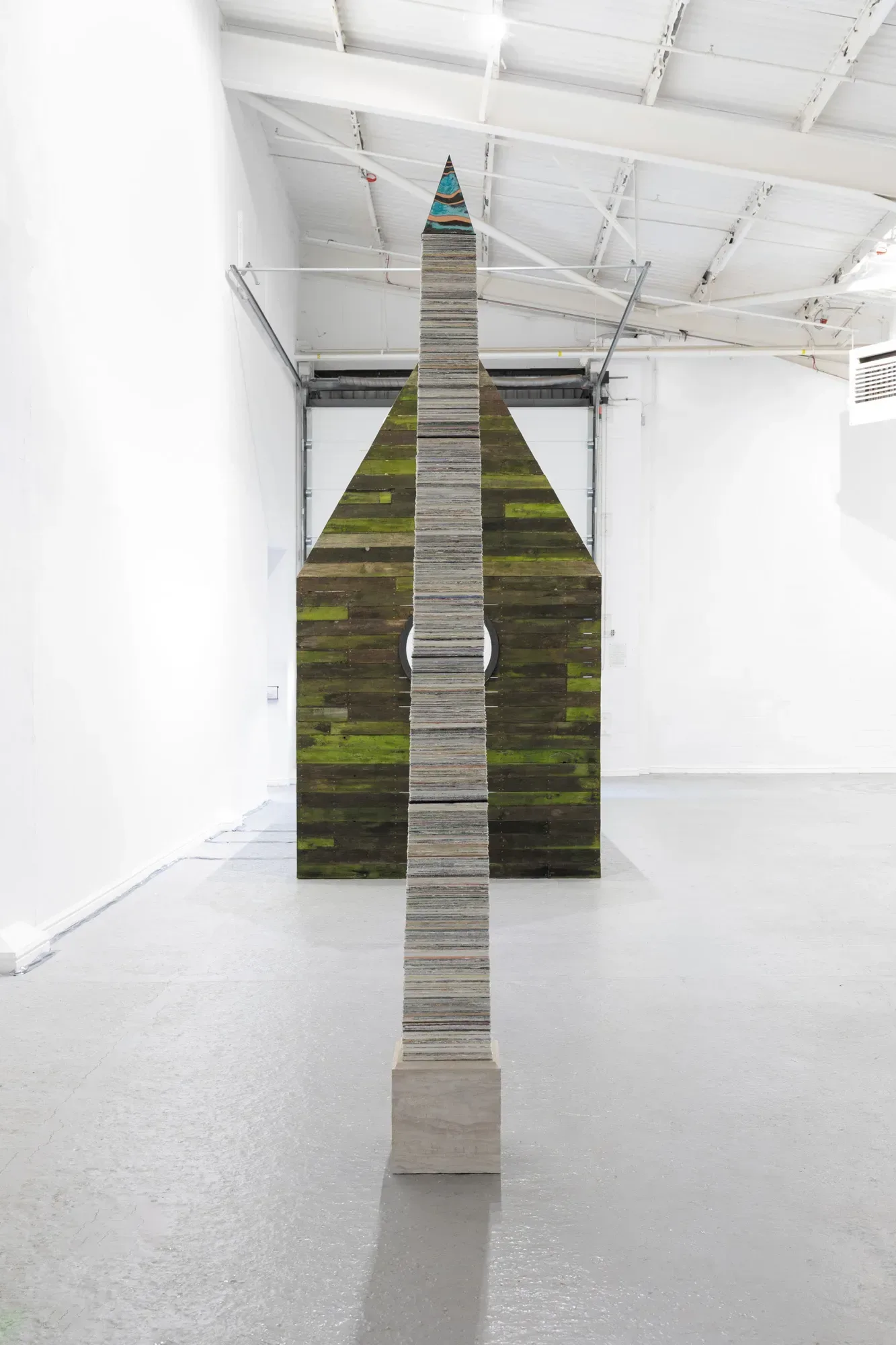 The Azimuth Obelisk (of sedimentary knowledge) is a reimagining of the concrete ‘obelisk’ erected at Hartland Magnetic Observatory in the late 1950's as a permanent azimuth mark from which the drift of the magnetic north pole is monitored via a theodolite through the north facing window of The Absolute Hut. Made from hundreds of hand torn reclaimed prints and drawings, this sculpture embodies the passage of time through a process of layering, holding the history of past works embedded within the stacked layers much as the Earth’s geological and magnetic history is secreted into the strata of sedimentary rock. The base is cast in non-magnetic Snowcrete mixed with crushed oyster shells and the pyramidion is made from patinated copper, all materials used in the buildings and architecture of a magnetic observatory.