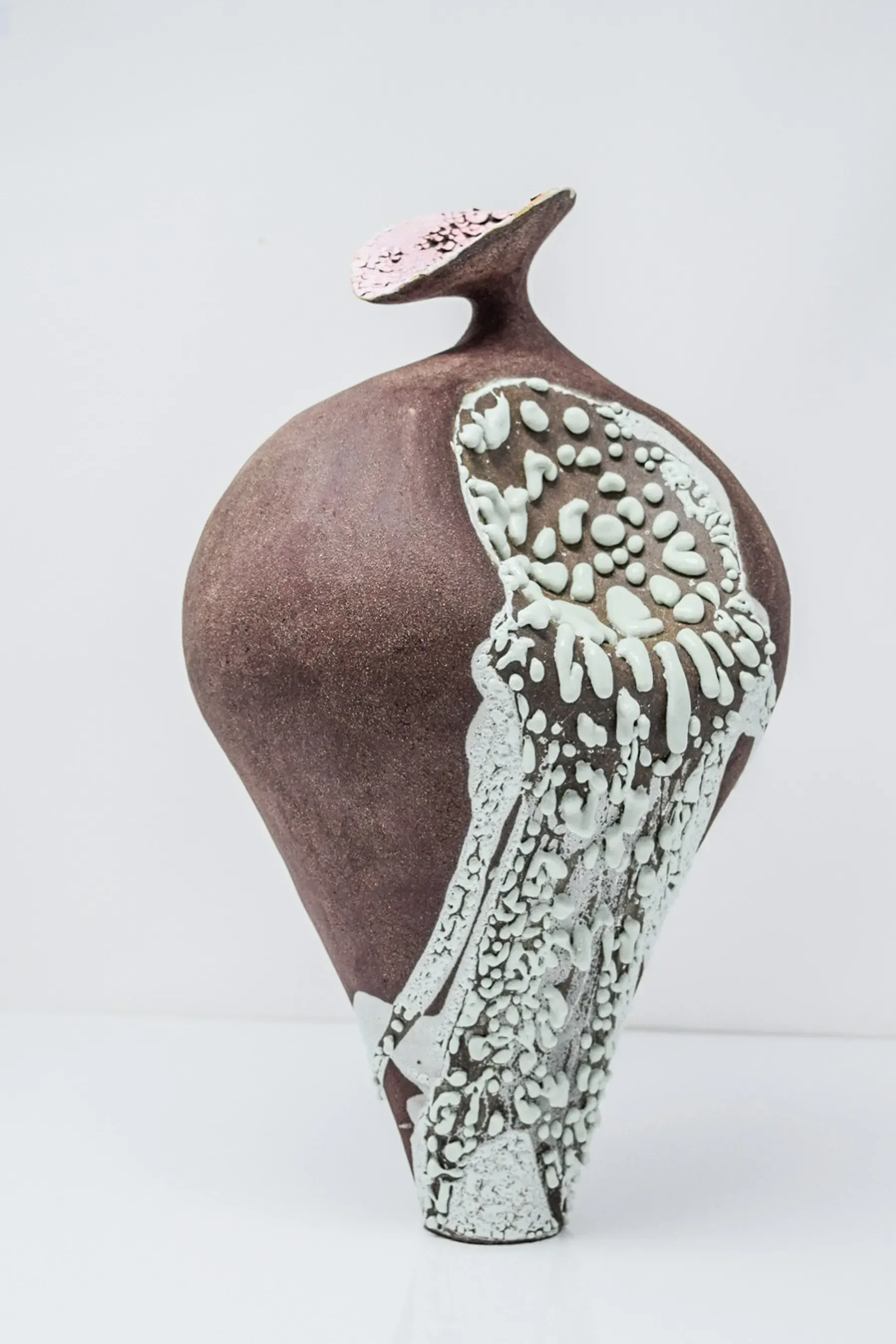 Aušrinė, Baltic Pagan Deity of Medicine, Health and Beauty is from a body of work; 'The Defective Goddesses'. Which are series of vessels that establishes a profound connection to the earth and life itself, embodying simplicity through reflective autobiographical creation. These vessels serve as a form of quiet activism, initiating dialogue about the often taboo topic of hidden illnesses. Stemming from my own struggles with hidden illnesses, this body of work advocates for increased visibility and enhanced medical research, especially when looking at women's bodies. Which intertwines with research into health over time, incorporating narratives from historical myths and legends of deities and goddesses by reflecting on how societal perceptions of secrecy have been constructed. Prompting reflection on who holds the power to affect change. In an era marked by a chronically underfunded healthcare system that is plagued with gender biases, this work poses fundamental questions about the origin of these disparities and how to achieve health care equality and equity.