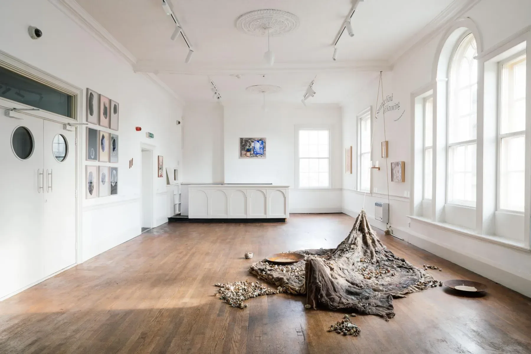 A Strange Kind of Knowing Exhibition, 2021 - 2022, Liv Penrose Punnett. Image credit Will Slater. Artists shown: Fourthland’s Mola Mola central, Verity Birt’s In Dark Derision (2021) back, and Kate McMillan’s My Body is A Cave (2021), left.