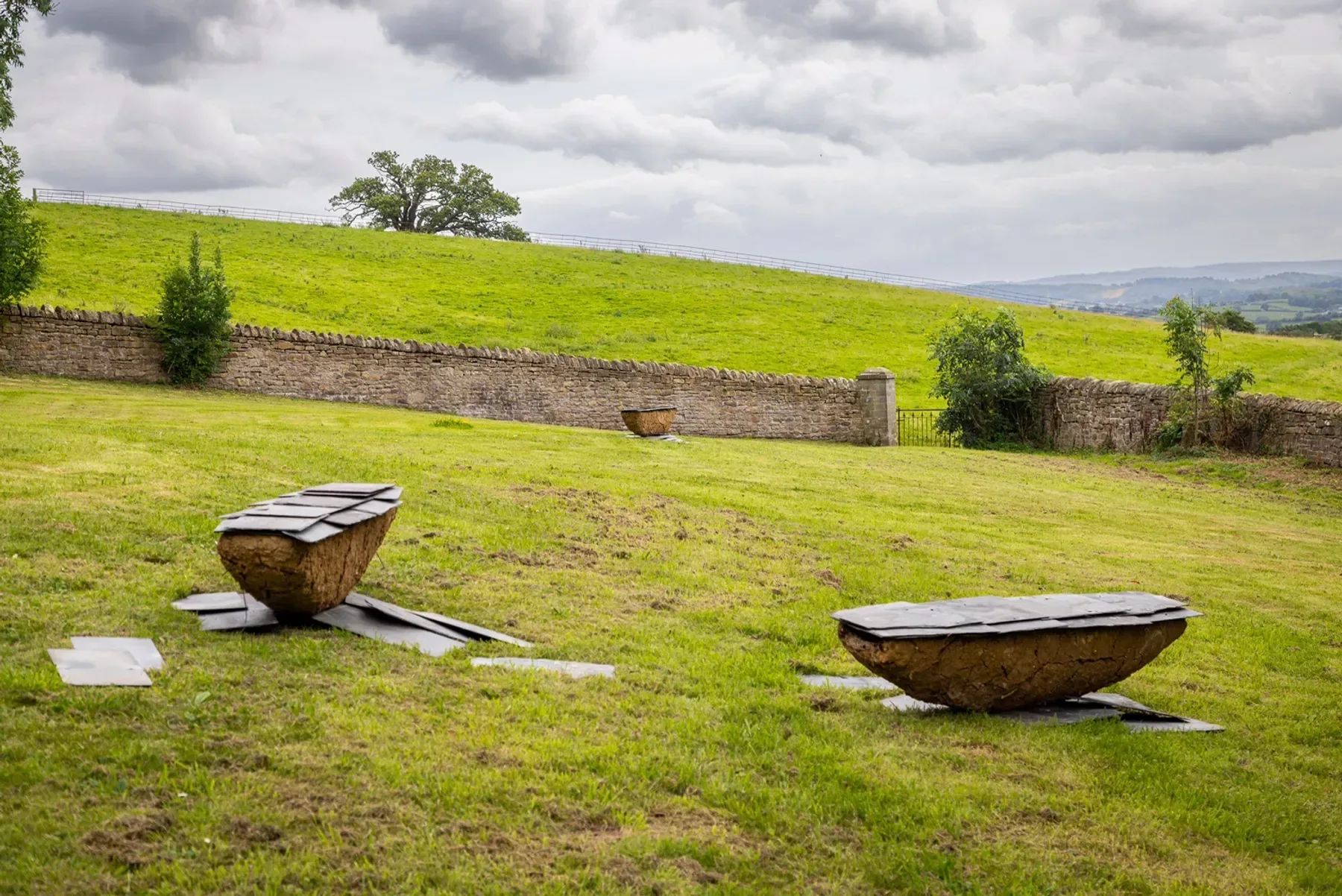 Maritime vessels are also used as a metaphor for the church, the word ‘nave’ deriving from the Latin – navis – for ship. In this sense, the whole church is called to be a vessel of God's love and grace, and to carry these gifts into the world. Barbara Beyer translates these ideas through her boat forms. Wiela, created from adobe clay, recycled wood and roof slates, are seemingly sturdy vessels with bare prominent cracks suggesting that they are also vulnerable to the elements despite the protective shelter of the slate roof tiles which offer sanctuary. The vessels are moored in the quiet churchyard of St Cadoc, Llangattock Vibon Avel. Jacquiline Creswell.