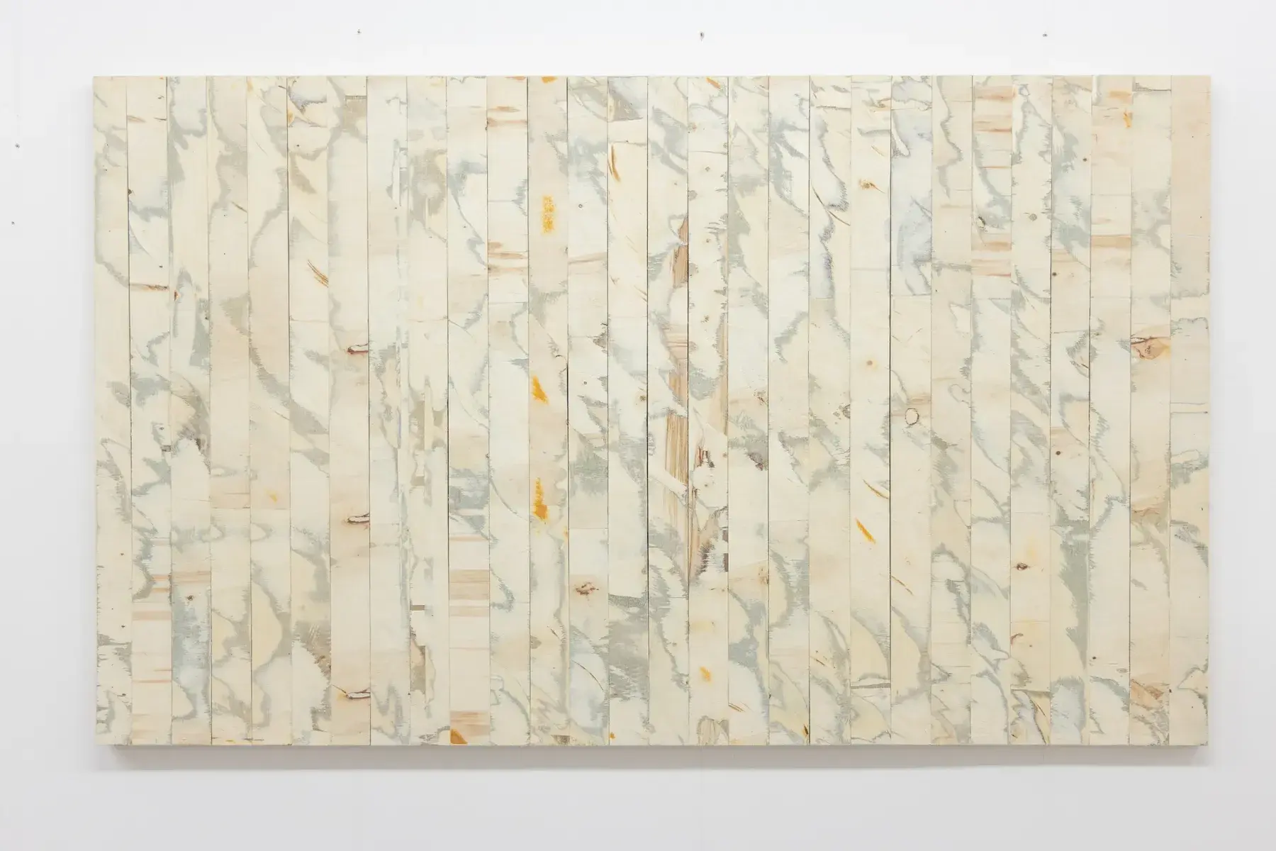 The pictures are based on satellite images of the White Sands Missile Range, a testing facility in the New Mexico desert. These source images, seen from above, record a century of mark making on the landscape. In these works, the uniform surface of the plywood is interrupted through mechanical processes, echoing the mark of the pencil, brush or rocket.