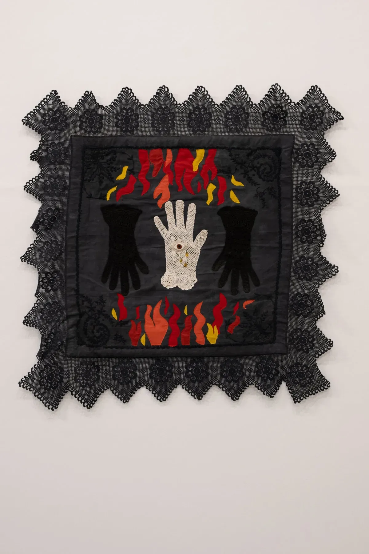 Table cloth, fabric and beads.