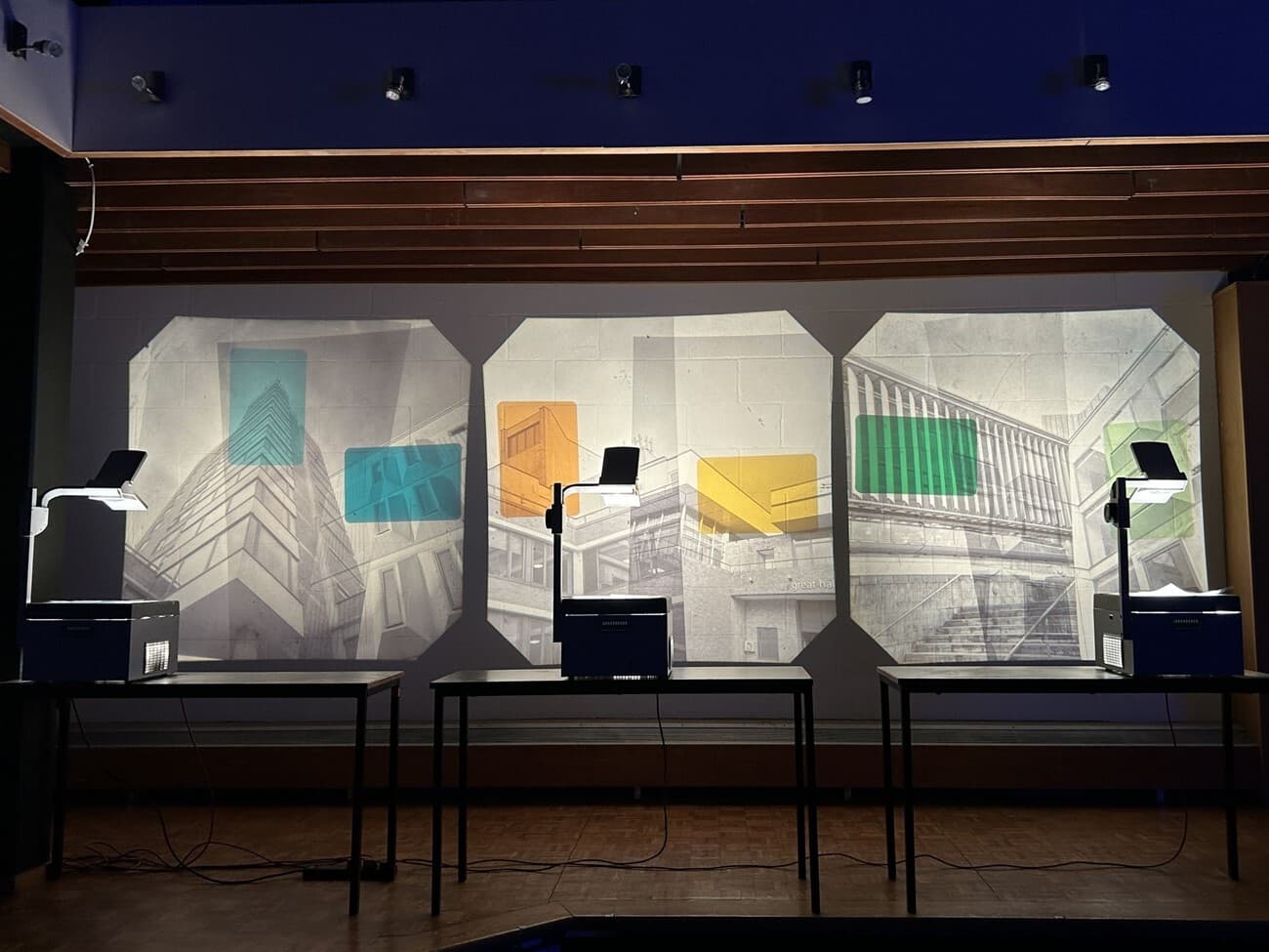 Compact, 2024, found OHPs, photographs on acetate, coloured filter strips, dimensions variable
