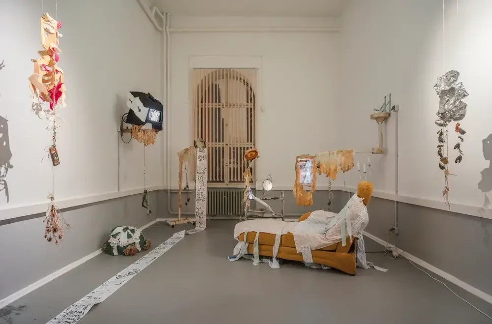 The work is guarded by two Sheela Na Gigs made from scrap materials important to the survival of sick and disabled people. The history of understanding or misunderstanding the Sheelas apotropaic uses is reflected in our understanding of birthing and recovering bodies.