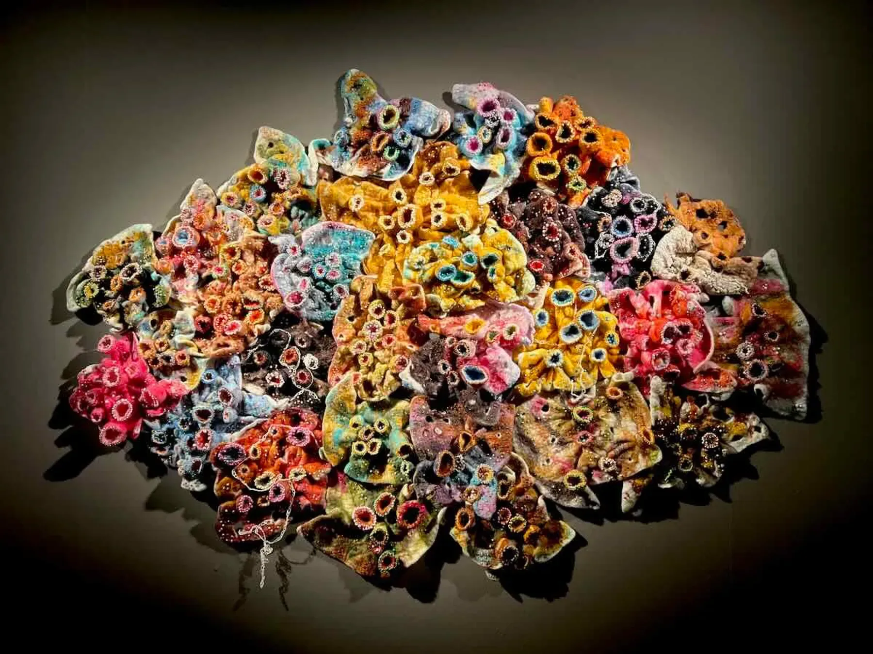 Materials: Wet felt, needle felt, beads, embroidery, sterilised gut bacteria from a diverse microbiome bile pigments.