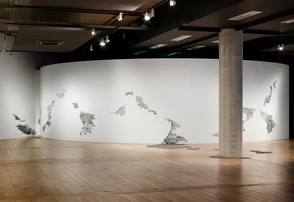 Resonance patterns created from unheard sound captured during dowsing inform this unique gallery drawing. Moving across the wall and floor as a series of connected carbon lines, it visualises vibrations, rhythms and waves weaving and colliding in an imaginary flow.