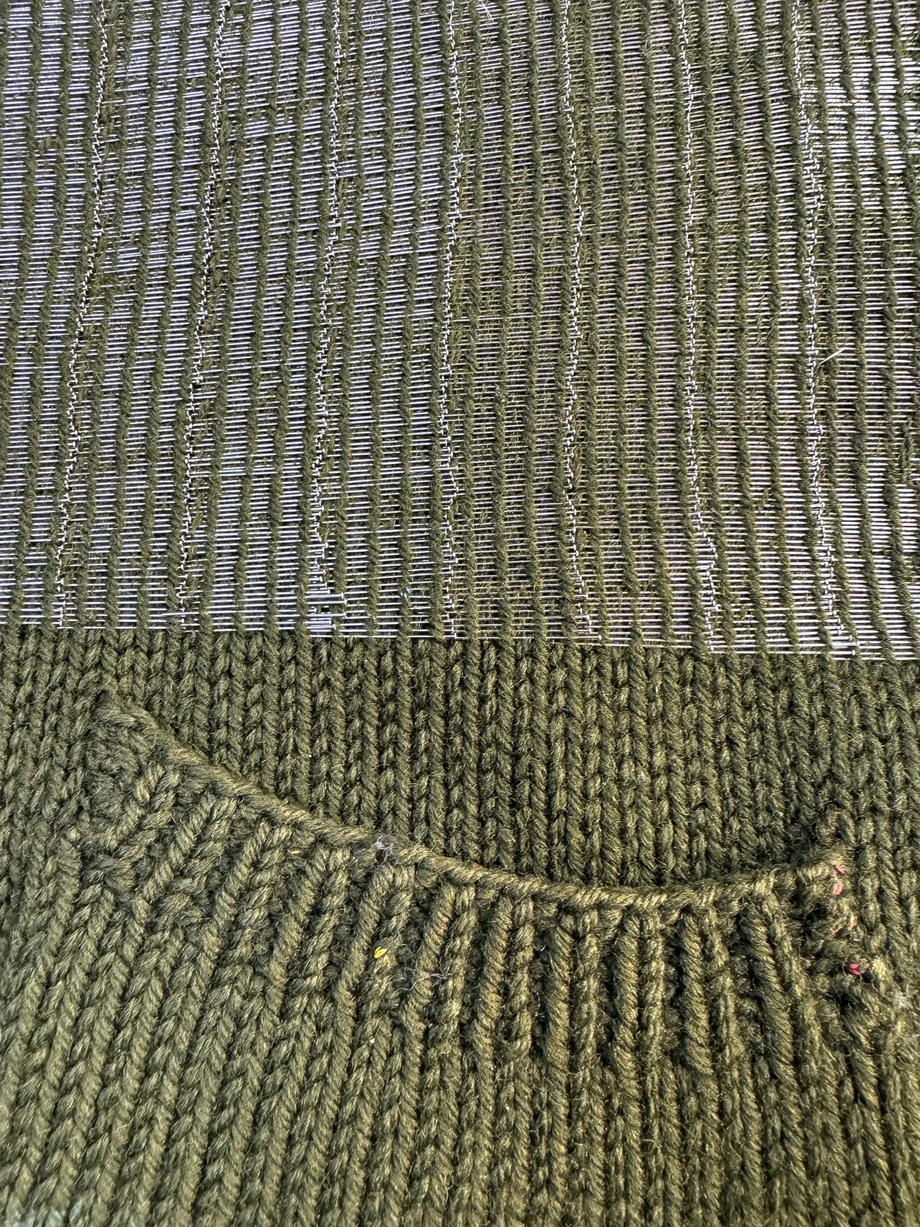 ‘Shimmer Effect’ explores the role of memory in my creative practice through a meticulous attention to the surfaces of a hand knitted jumper and the lining of a dome tent. Through the insertion of delicate pins and the creation of a warp-like structure I have attempted to consider what I may learn from these objects. As natural sunlight shines into the attic space of Salts Mill the installation becomes an analogous landscape in my locality that shimmers with life. I relive the experience back into the objects in an attempt to capture the spirt of what has been remembered.