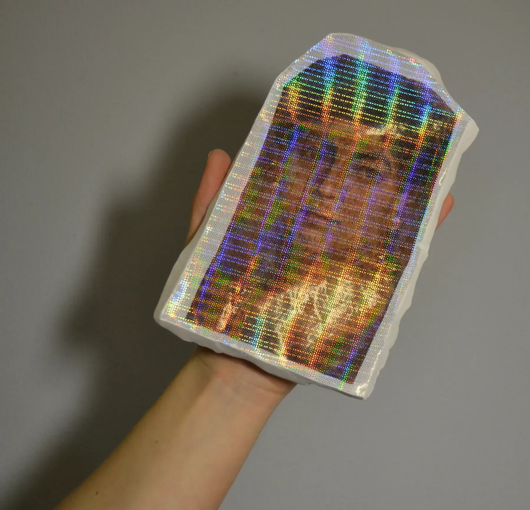 New Rehang (series 3) are a set of objects that begin with a catalogue of artifacts from The British Museum. Liberated from the page, coated in holographic transparent vinyl and backed with plaster cast in the artists hand, the series considers ways in which objects that are not able to be accessed by bodies can be known, and the durational experience of standing in front of something.