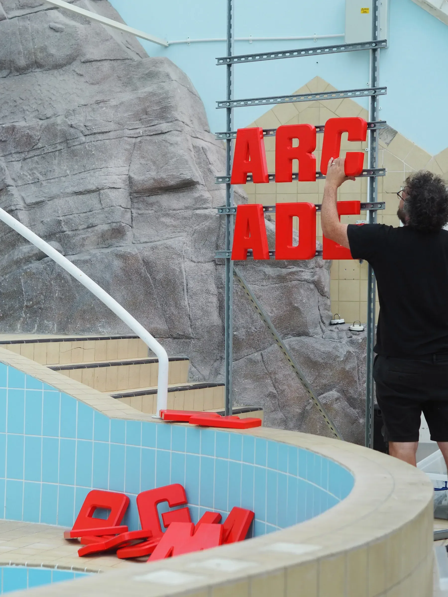 The font used was inspired by text on the ‘Automatic Change Giver’ machine in an arcade in St Ives. The simple font style functional yet authoritative, with red chosen for it’s prevalence in the rooftop signage mentioned earlier as well as for its contrasts against the blue of the pool. Its location in the space both overlooks the rest of the exhibition while the backdrop of the fake rocks creates a filmic landscape quality.
