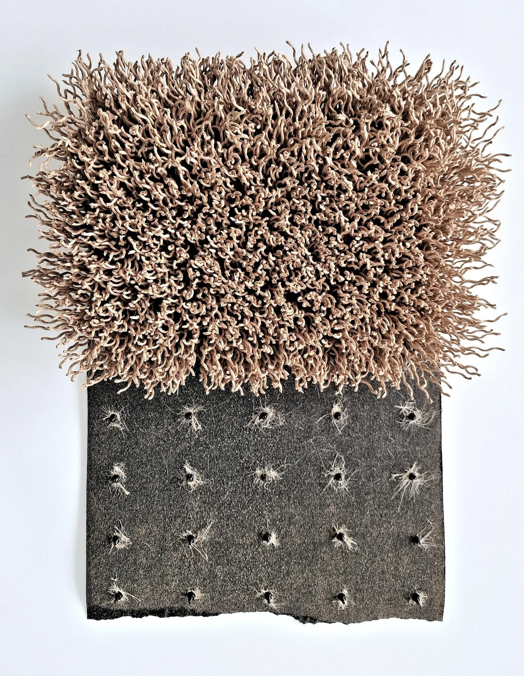 The artwork is a wall based, sculptural, mixed-media relief. It reflects my concern for the environment and the impact human activity is having on ecosystems and biodiversity. The dense tangle of spiky paper cord, alludes to the natural world – unruly and teeming with life. In contrast, the organic forms give way to featureless roofing felt representing the construction industry, relentlessly replacing nature. The piece aims to highlight the delicate balance between progress and preservation in our rapidly changing world.