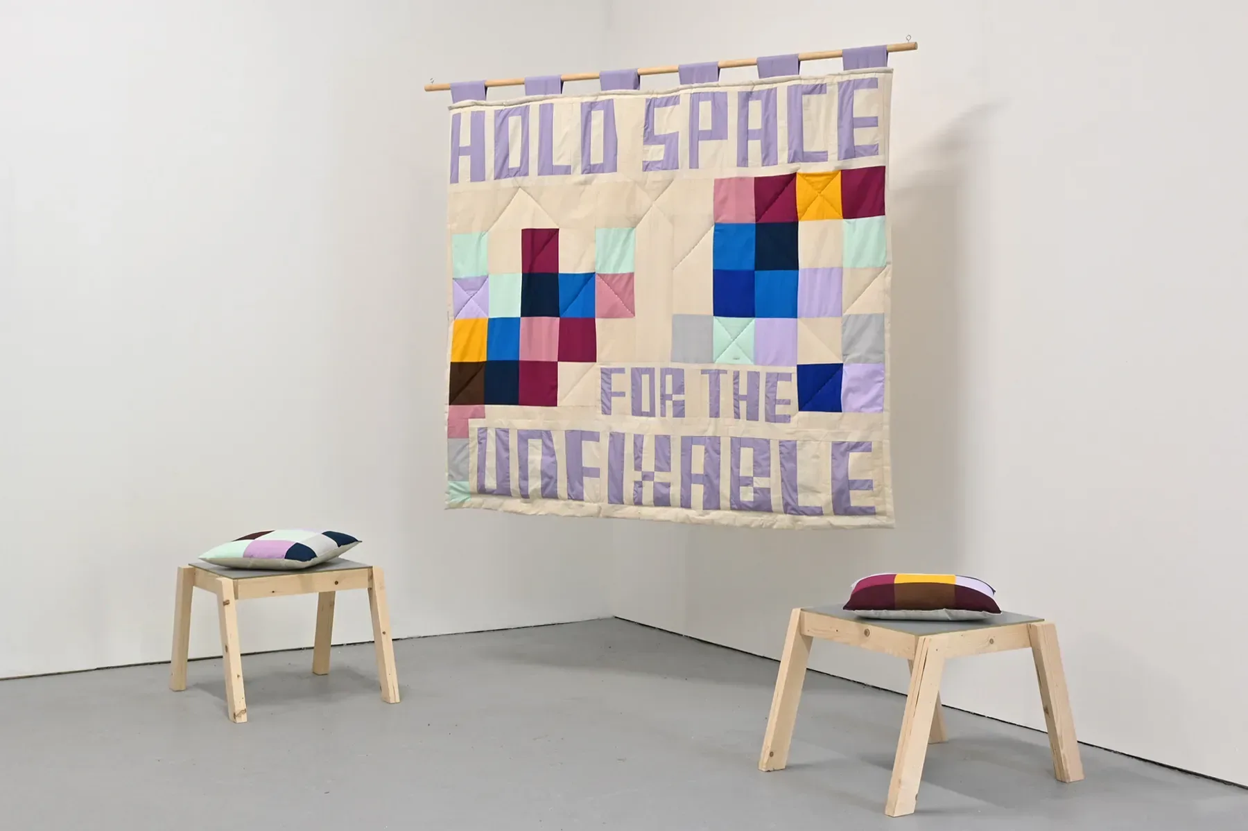 Hold Space for the Unfixable was ‘pieced’ by Chris Alton & Emily Simpson and quilted by people taking part in a conversation about living with grief. The conversation was held at Paradise Works as part of the exhibition Unbearable Lightness of Being, Sept-Oct 2024.