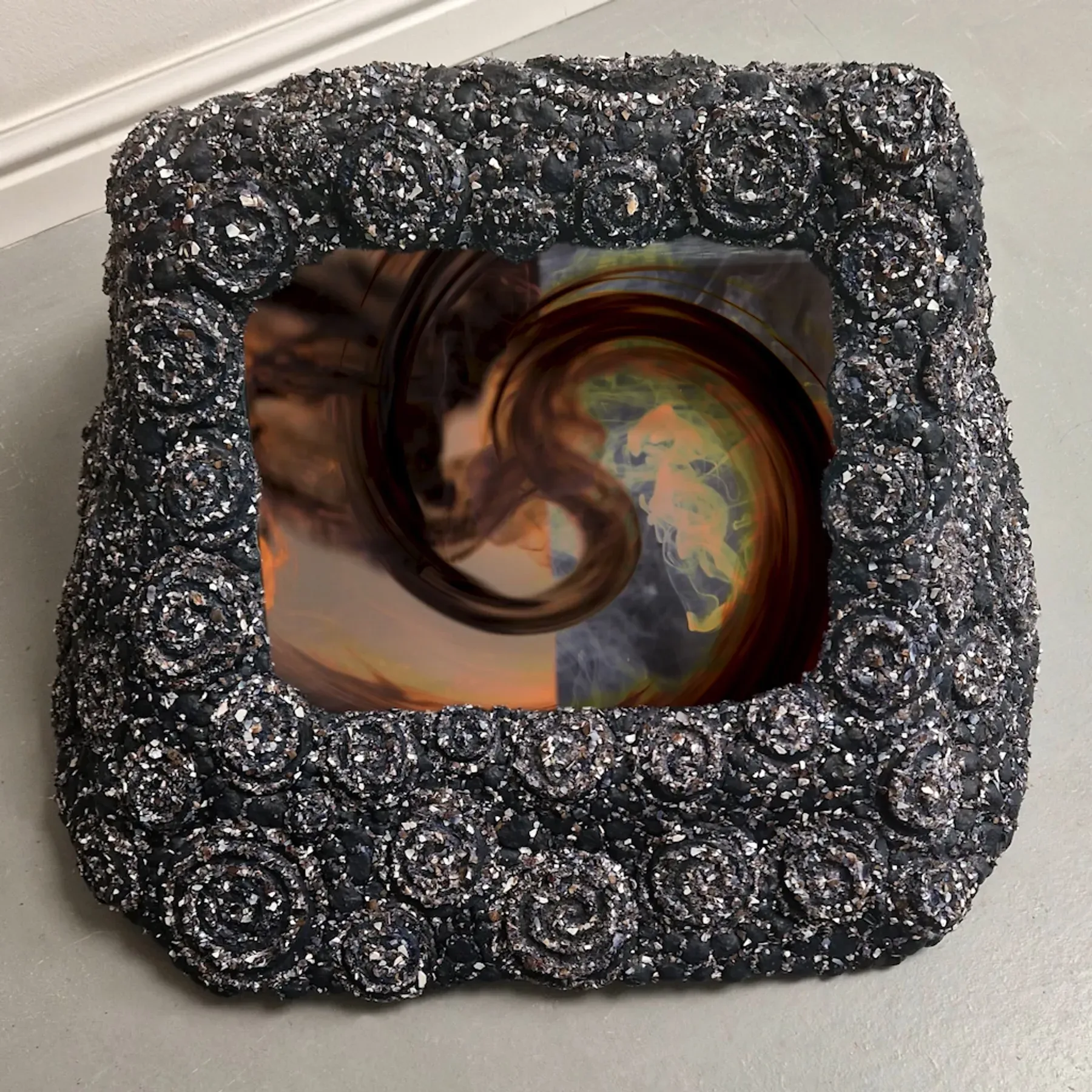 Under a crusted shell, surfaces slide and scrape along lines of fissure, distended innards ooze and rocks moan as they are distorted by untold pressure. The turbulent spiralling of the molten core births rock and lifeforms which are acted upon by the drag of an oscillating magnetic field. A hybrid between rock, mollusc and technology this video sculpture responds to the first mollusc’s desire to communicate and urge to create as described by Italo Calvino in his story ‘The Spiral’. We don’t always know what we are creating.