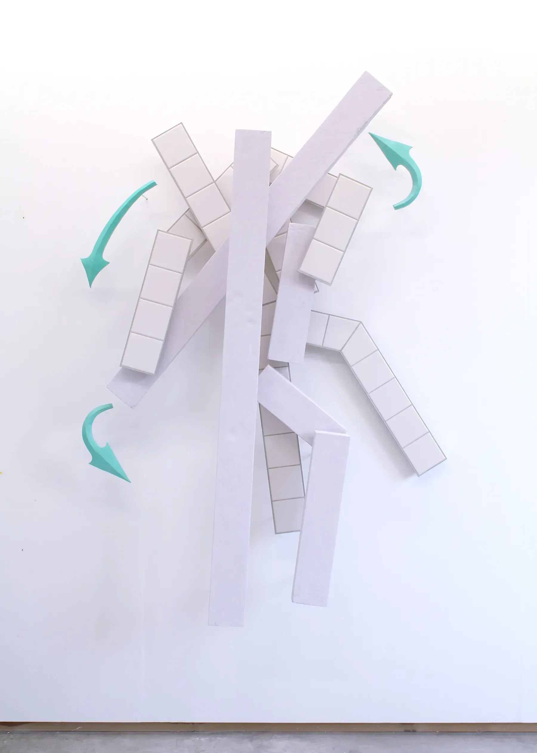 The work’s colour-pallet is derived from the colours used in UK Suffragette movement’s insignia - purple, white and green. The blocky architectural fragments are redolent of the bricks suffragettes carried in their handbags and used to smash windows as part of their protests.