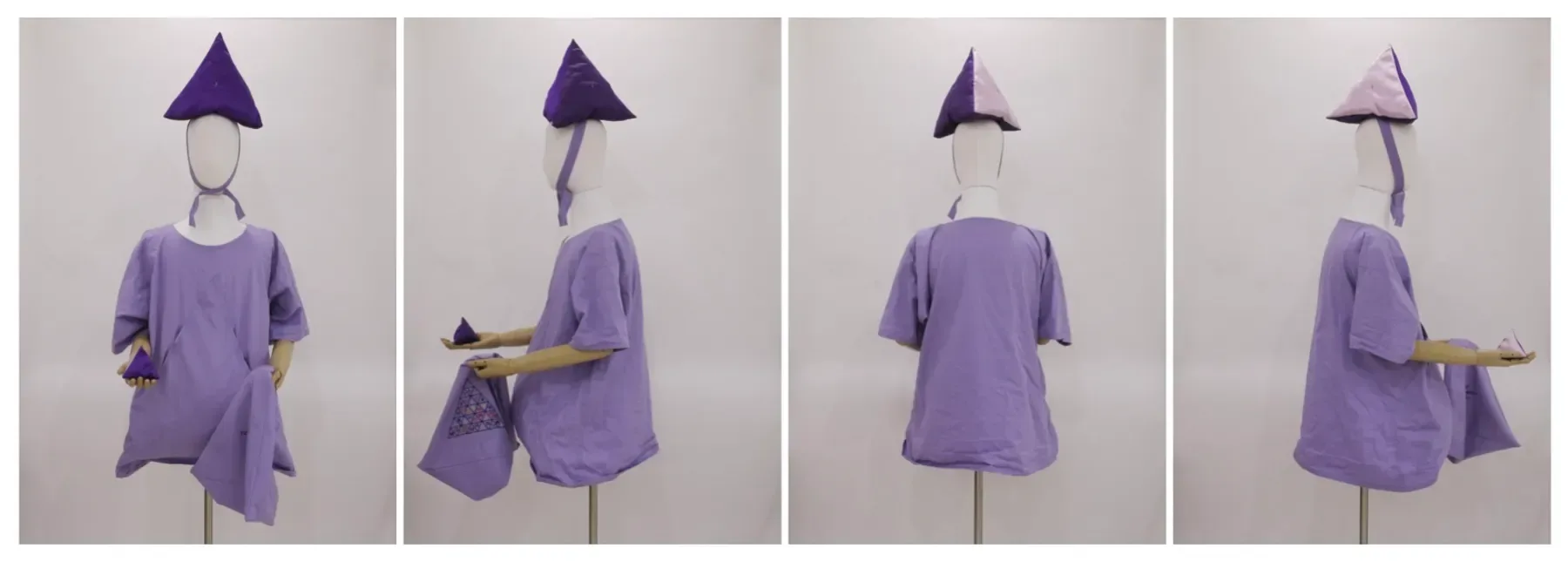 Embroidered fabric triangular pyramid pouch, traingular pyramid headdress, smock, 36 small stuffed triangular pyramids