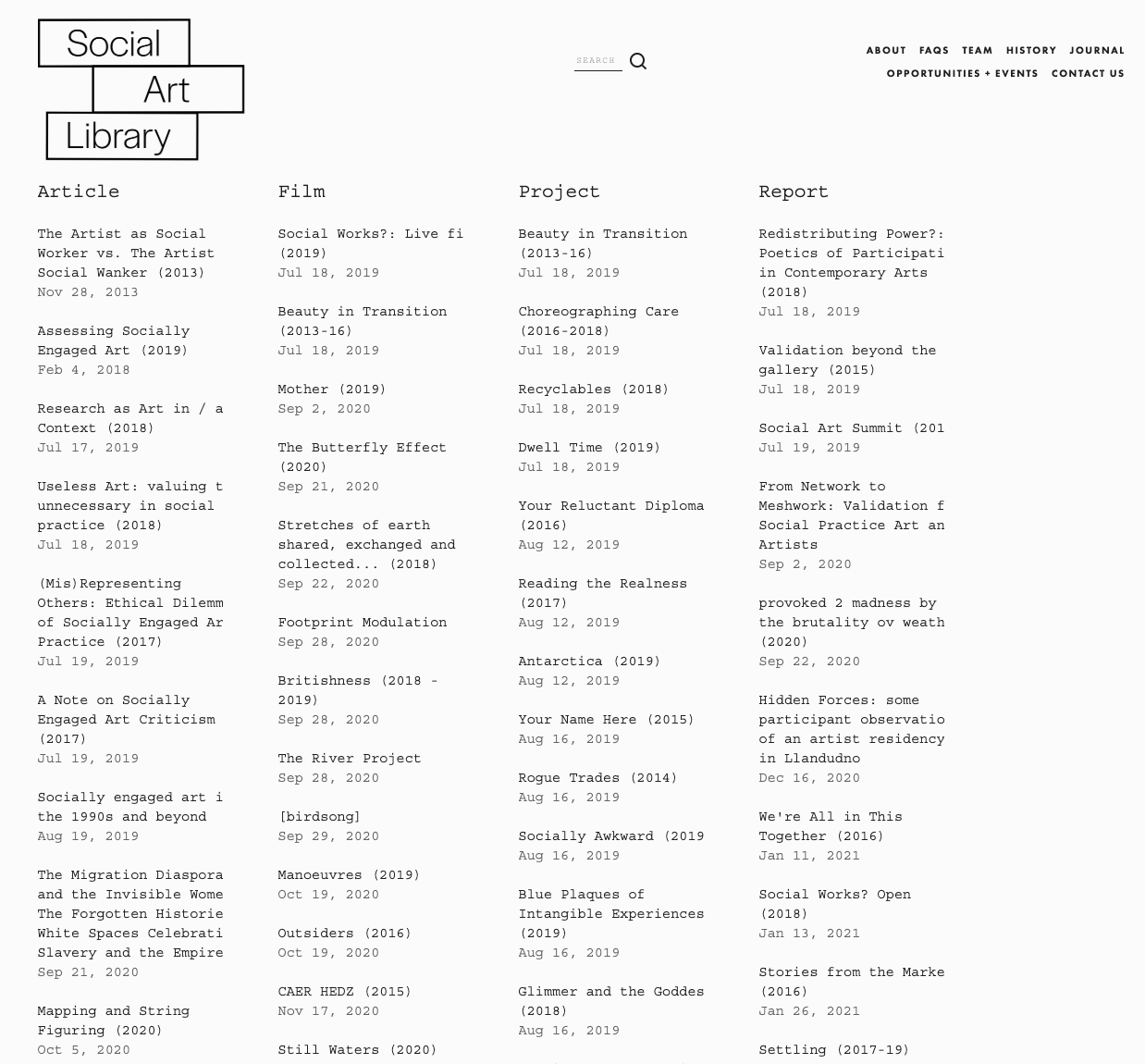 The Social Art Library platform launched in Beta in July 2020, bringing together artist-submitted projects, publications and videos supported by commissions, residencies and events. While it remains live today, the Library is now presented as a living archive, a resource for artists, researchers and communities to explore how social practice has evolved over the past decade.